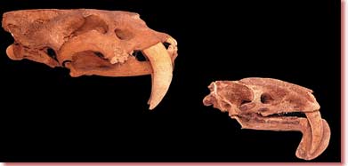 Böyük dişlərə sahib olan və bir-biri ilə heç bir əlaqəsi olmayan iki məməli. Plasentalı və kisəli məməlilər arasındakı fövqəladə oxşar “ekiz”lərə başqa bir nümunə: yırtıcı məməli Smibdon (sağda) və Thylacosmilusdur (solda). Hər ikisi böyük qabaq dişlərə sahib olan və heç bir təkamülçü əlaqənin qurulması mümkün olmayan bu canlıların kəllə sümükləri və diş quruluşlarının oxşar olması bənzər quruluşlara sahib olan canlıların təkamülə sübut olaraq təqdim olunan hemologiya anlayışını cıxılmaz vəziyyətə salır.