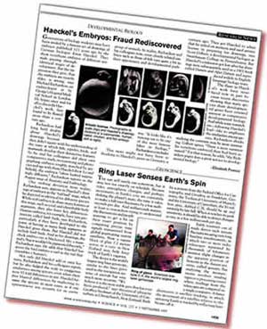 “Elm” (Science) jurnalındakı məqalədə Hekkelin bu məsələ ilə bağlı etiraflarının bu əsrin əvvəlindən etibarən ört-basdır edildiyindən və saxta rəsmlərinin dərs kitablarında elmi həqiqət kimi öyrədilməyə başlanmasından da belə bəhs edir: