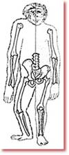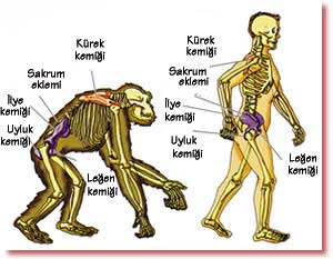 |  İnsan skeleti dik yeriməyə uyğun   olaraq   yaradılmışdır. Meymun skeleti isə önə əyilmiş  quruluşu, qısa ayaqları və uzun qolları ilə  dörd ayaqlı hərəkət şəklinə uyğundur. Bu iki quruluş arasında bir keçid  formasının əmələ gəlməsi isə bu keçid formasının  əlverişsizliyinə görə  mümkün deyildir. |  Buraya qədər təhlil etdiyimiz bütün fosillərlə bərabər insanlarla meymunlar  arasındakı keçilməz anatomik sərhədlər də insanın təkamül nağılını təkzib edir.  Bu keçilməz sərhədlərdən biri də yerimə formasıdır.İnsan iki ayağı üzərində dik yeriyir. Bu, başqa heç bir canlıda rast gəlinməyən,  çox spesifik hərəkət formasıdır. Digər bəzi heyvanlar isə iki ayaqla çox məhdud  hərəkət qabiliyyətinə malikdirlər. Ayı və meymun kimi heyvanlar nadir hallarda  (məsələn, bir qidanı əldə etmək istədikdə) iki ayaqları üzərində qısa müddət ərzində  hərəkət edə bilirlər. Normal hallarda önə doğru meyillənmiş skeletə malikdirlər  və dörd ayaq üzərində yeriyirlər.
