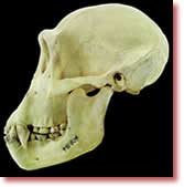 Yuxarıda  Australopithecus  afarensis AL 444-2  fosilinin kəllə sümüyü, altda isə indi  yaşayan şimpanzenin kəllə sümüyü görünür.  Arada cox oxşarlıq var. A.afarensisin   heç bir  insani xüsusiyyəti  olmayan adi meymun  növü olduğunun cox  açıq  sübutudur. |   Homo habilis  Avstralopitekin skelet və kəllə sümüyü quruluşunun şimpanzelərdən o qədər də  fərqlənməməsi və bu canlıların dik yeriməsi iddiasının əsaslı dəlillərlə  çürüdülməsi təkamülçü paleoantropoloqları çətin vəziyyətdə qoymuşdur. Çünki xəyali  təkamül sxemlərində Avstralopitekdən sonra Homo erectus gəlir. Homo  erectus adının əvvəlindəki "homo" (yəni "insan")  terminindən də bilindiyi kimi, bu, insan qrupudur və skeleti də dikdir. Kəllə  sümüyünün həcmi Avstralopitekdən iki dəfə böyükdür. Şimpanzeyə bənzəyən meymun  növü olan Avstralopitekdən bugünkü insandan fərqlənməyən skeletə malik Homo  erectusa keçid isə təkamül nəzəriyyəsinə görə də mümkün deyil. Bu səbəbdən,  "əlaqə"lər, yəni "ara keçid forma"lar lazımdır. Homo  habilis anlayışı da məhz bu zərurətdən doğmuşdur. Homo habilis 1960-cı illərdə ailəliklə "fosil ovçusu" olan Likeylər tərəfindən  ortaya atıldı. Likeylərə görə, Homo habilis kimi tərif etdikləri bu yeni canlı  növü dik yerişə, nisbətən böyük beyinə, daş və taxtadan alət hazırlayıb istifadə  etmək qabiliyyətinə sahib idi. Bu səbəbdən, insanın əcdadı ola bilərdi.