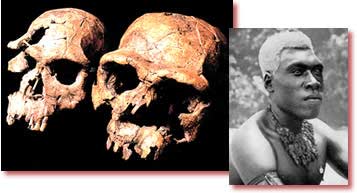 Homo erectus və AborigenHomo  eractusun hər hansı bir ibtidai xüsusiyyəti olmayan  əsl insan irqi olduğunu göstərir.Soldakı Turkana uşağı skeleti. Bu günə qədər  tapılmış  bütöv Homo erectus nümunəsi.   Maraqlı olan 1,6 milyon illik fosilin   skeleti ilə dövrümüzdə yaşayan insan arasında heç bir gözəçarpan  bir fərqin olmamasıdır. Xüsusilə üstdəki  Aborigen yerlisi fosili, Turkana uşağına çox oxşayır. Bu vəziyyət
