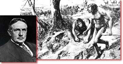 |  Nebraska adamı və onu adlandıran Henri  Fairfeld Osborn. |  Bütün bu ssenarilər bircə dənə  dişə görə uyduruldu. Təkamülçü dairələr bu "xəyali adamı" o dərəcə mənimsədilər  ki, Uilyam Brayen adlı bir tədqiqatçı bircə azı dişinə əsaslanaraq bu qədər qəti  qərarların verilməsinə qarşı çıxdıqda hər cür tənqidə məruz qaldı.  Lakin 1927-ci ildə skeletin digər hissələri tapıldı. Məlum oldu ki, bu diş  nə meymuna, nə də insana aiddir. Diş "prosthennops" adlı vəhşi  Amerika donuzunun nəsli kəsilmiş bir cinsinə aid imiş. “Science” jurnalında Uilyam Qreqorinin bu yalanı xəbər  verdiyi məqaləsinin başlığı belə idi: "Belə görünür ki, Hesperopithecus nə meymundur, nə də  insan”236 Nəticədə Hesperopithecus haroldcookinin və "ailəsi"nin bütün şəkilləri  dərhal elmi ədəbiyyatdan çıxarıldı. Nəticə Təkamül nəzəriyyəsini dəstəkləmək üçün edilən bütün bu elmi saxtakarlıqlar  və ön mühakiməli dəyərləndirmələr bu nəzəriyyənin elmi açıqlamadan daha çox  ideologiya olduğunu göstərir. Hər bir ideologiyada olduğu kimi, bu ideologiyanın  da fanatik tərəfdarları var və bunlar təkamülü nəyin bahasına olsa da, sübut  etməyə çalışırlar. Nəzəriyyəyə elə doqmatik tərzdə bağlanıblar ki, əllərinə keçən  hər yeni kəşfi, təkamüllə heç bir əlaqəsi olmadığı halda nəzəriyyəyə böyük dəlil  hesab edirlər. Şübhəsiz, bu, elm adından deyilən böyük yalandır; çünki elm  dünyasının əsassız bir doqma uğrunda səhv istiqamətləndirildiyini göstərir.Skandinaviyalı elm adamı Soren Lovtrup isə  “Darvinizm: bir əfsanənin təkzibi” (Darwinism:  The refutation of a myth) adlı kitabında bu mövzuda belə deyir: