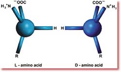 |   Eyni amino asitin sol əlli (L) və sağ əlli ( D)  izomerləri.Canlılardakı  zülallar sadəcə sol əlli amino asitlərdən ibarətdir. |  Hər iki növ amin turşusu bir-birləri ilə asanlıqla  bağlana bilir. Ancaq aparılan təhlillərdə təəccüblü həqiqət üzə çıxmışdır: ən  ibtidai orqanizmdən ən alisinə qədər bütün canlılardakı zülallar sadəcə sol əlli  amin turşularından əmələ gəlir. Zülalın tərkibinə qatılan bir sağ əlli amin  turşusu belə o zülalı yararsız hala salır. Hətta bəzi təcrübələrdə  bakteriyalara sağ əlli amin turşuları əlavə edilmiş, ancaq bakteriyalar bu amin  turşularını dərhal parçalamışlar, bəzi hallarda isə bu parçaladıqları amin  turşularından yenidən öz istifadələri üçün sol əlli amin turşuları inşa etmişlər.  Bir  anlıq təkamül nəzəriyyəsinin iddia etdiyi kimi, canlıların təsadüflərlə əmələ gəldiyini  fərz edək. Bu halda yenə təsadüflərlə əmələ gəlmiş amin turşuları təbiətdə sağ  və sol əlli olmaq üzrə bərabər miqdarda olacaqdılar. Ona görə, bütün canlıların  tərkibində sağ və sol əlli amin turşuları qarışıq miqdarda olmalıydı. Çünki  kimyəvi cəhətdən hər iki qrupdan olan amin turşularının da bir-birləri ilə  asanlıqla birləşməsi mümkündür. Lakin bütün canlı orqanizmlərdəki zülallar  ancaq sol əlli amin turşularından ibarətdir.  Zülalların  bunların içindən necə sadəcə sol əlli amin turşularını seçdikləri və necə  aralarına heç bir sağ əlli amin turşusunun qarışmadığı elm adamlarının heç cür  izah edə bilmədikləri mövzulardan biri kimi qalmışdır. Bu cür xüsusi və şüurlu  seçicilik təkamül nəzəriyyəsinin düşdüyü çıxılmaz vəziyyətlərdən biridir.Habelə  açıq şəkildə göründüyü kimi, zülalların bu xüsusiyyəti təkamülçülərin “təsadüf”  müəmmasını daha da içindən çıxılmaz vəziyyətə salır: “yararlı” bir zülalın əmələ  gəlməsi üçün bir az əvvəl də izah etdiyimiz kimi, sadəcə onu təşkil edən amin  turşularından bəlli miqdarda qüsursuz düzülüşdə və xüsusi üç ölçülü dizayna  uyğun şəkildə birləşmələri də kifayət deyil. Bütün bunlarla yanaşı bu amin  turşularının hamısının sol əlli olanlar arasından seçilməsi və içlərində bir dənə  də sağ əlli amin turşusu olmaması da vacibdir. Çünki amin turşusu zəncirinə əlavə  edilən bir səhv sağ əlli amin turşusunun səhv olduğunu müəyyən edərək onu zəncirdən  çıxaracaq hər hansı təbii seçmə mexanizmi də mövcud deyil. Buna görə, bir sağ əlli  amin turşusu da sol əlli amin turşularının arasına qarışmamalıdır. Bu da təsadüf  anlayışını bir daha əsassız edir. Bu vəziyyət “Britannika elmi ensiklopediyası”nda belə  ifadə edilir:
