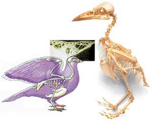 Quşların skletlərini təşkil edən sümüklərin içi dinozavrların və sürünənlərin sümüklərinin əksinə boşdur. Bu boşluq skletə sağlamlıq və yüngüllük verir. Quşların skelet quruluşlarının eynisi, günümüzdə təyyarələrdə, körpüləridə və bəzi qurğularda istifadə edilməkdədir. Dinozavrların sümükləri ,böyük və sağlam olduqları üçün qalındır və içi doludur.Amma yaşayan və nəsli kəsilmiş bütün quşların sümüklərinin içi boşdur və bunun sayəsində yüngüldür.