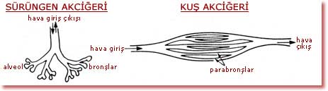 Quşlarda isə hava ağciyər kanalı boyu “tək-tərəfli” hərəkət edir. Ağciyərlərin giriş və çıxış kanalları bir-birlərindən fərqlidir və bu kanallar boyu uzanan xüsusi hava kisəcikləri sayəsində hava daima ağciyərin içində tək istiqamətdə axır. Bu sayədə quş havadakı oksigeni fasiləsiz qəbul edir. Beləliklə, quşun yüksək enerji tələbatı təmin edilir. “Avien ağciyər” adlanan bu xüsusi tənəffüs sistemi Maykl Denton tərəfindən “Böhran içində olan nəzəriyyə” (A theory in crisis) adlı kitabında belə izah edilir: